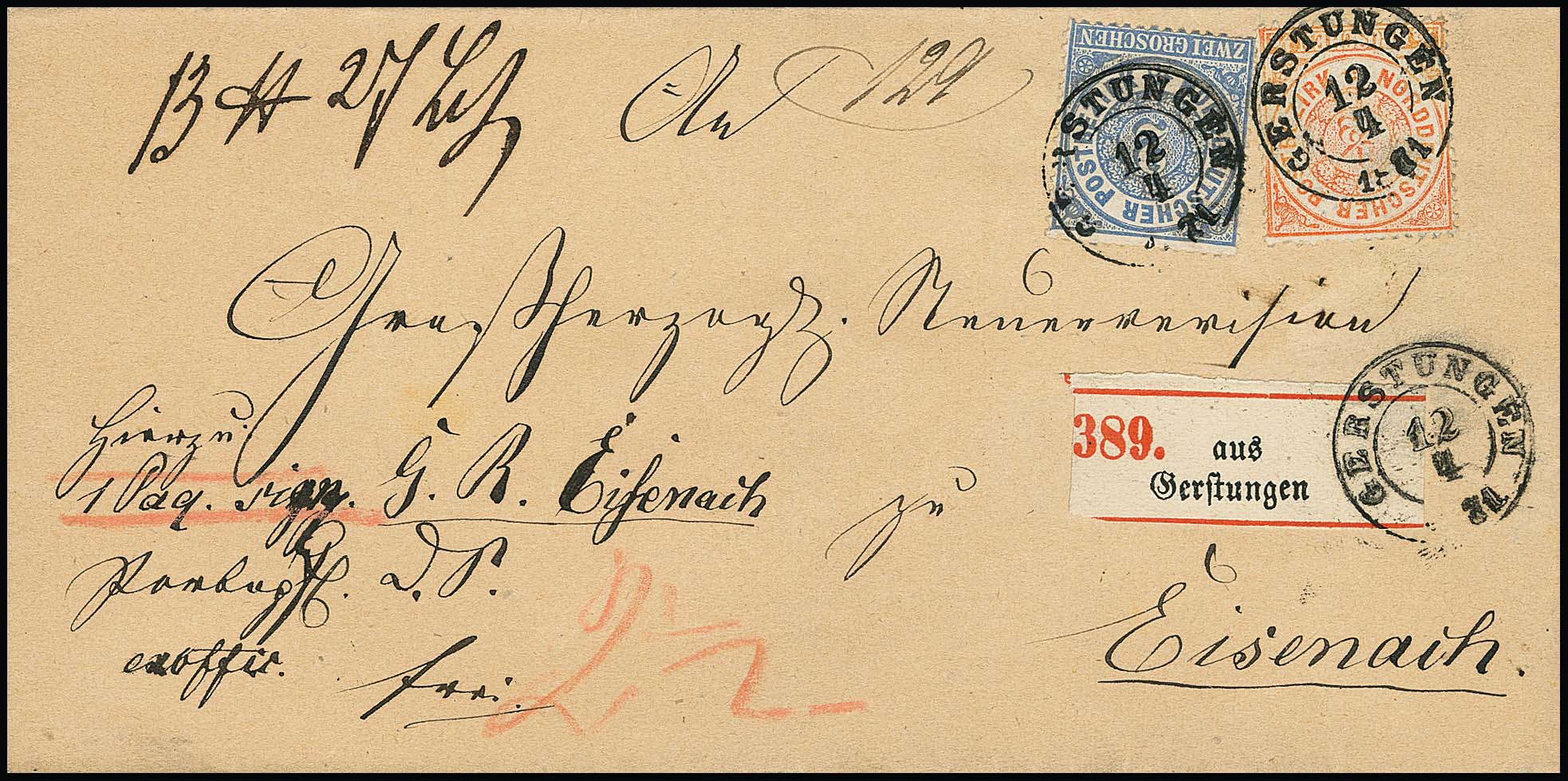 "Gerstungen", nachverw. K2 auf Paketbegleitbrief mit NDP 1/2 und 2 Gr., sowie auf Brief 1 Gr. NDP