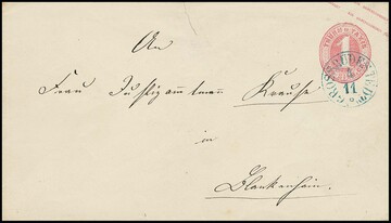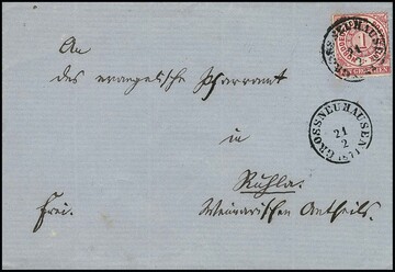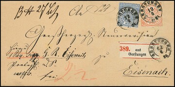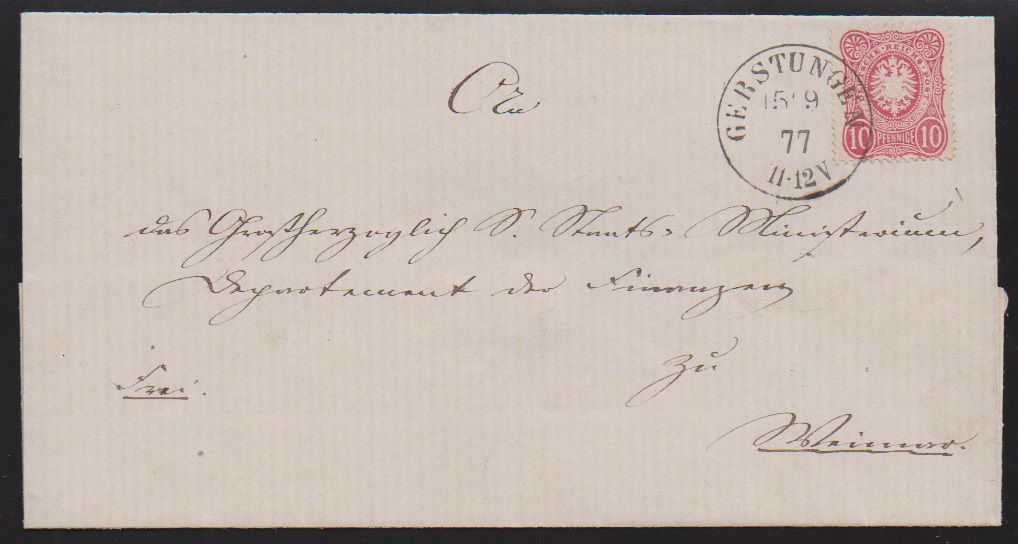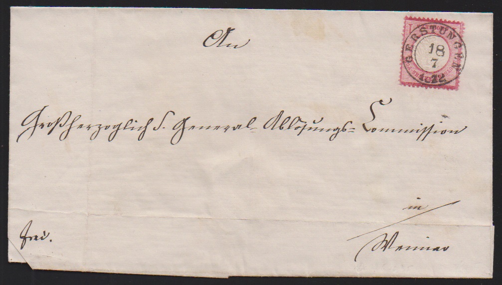 "Gerstungen", nachverw. K2 auf Brief (Falten ausserhalb) mit 1 Gr. kl. Brustschild, sowie Ablöse-K1 auf Brief 10 Pfge. 1877