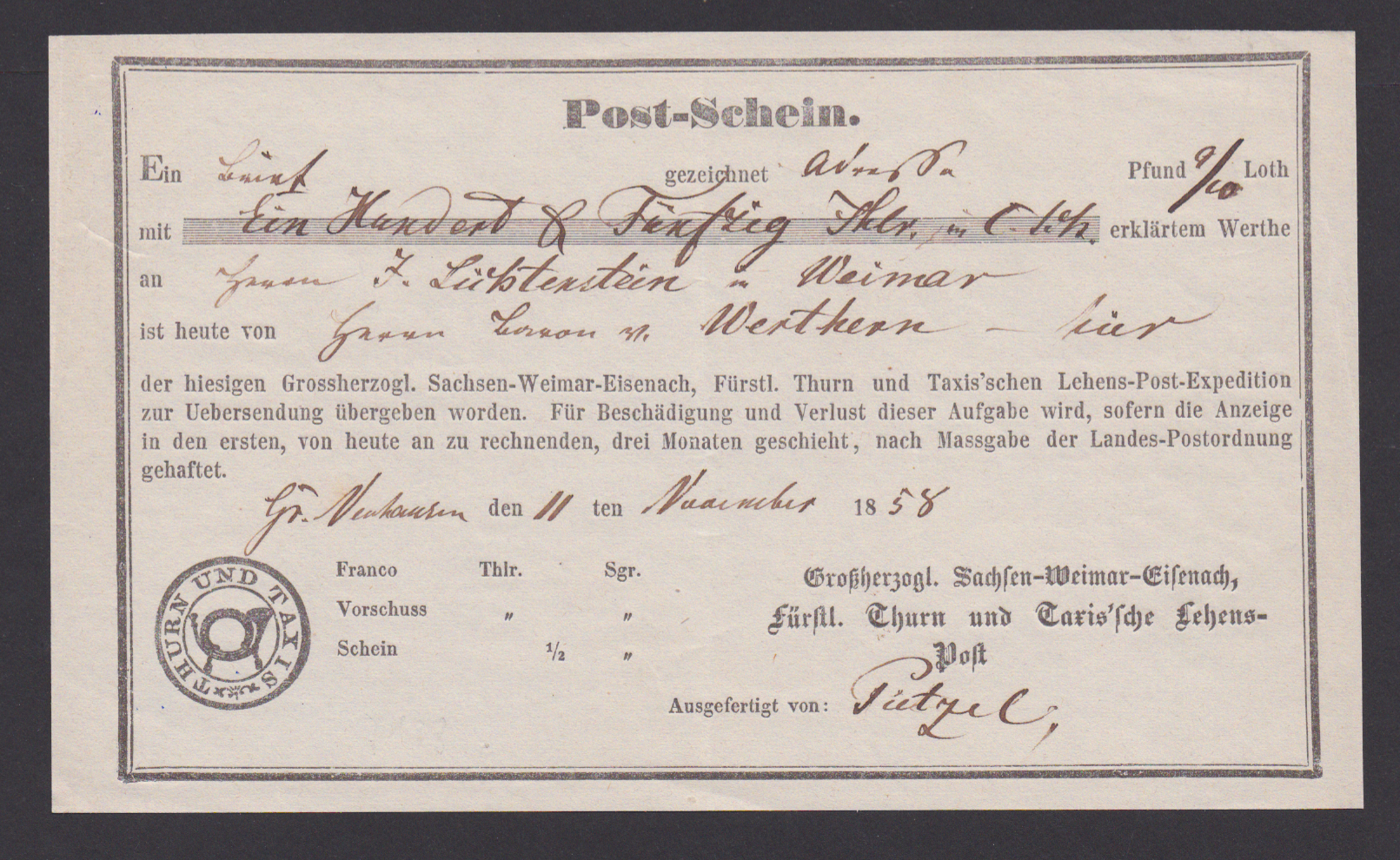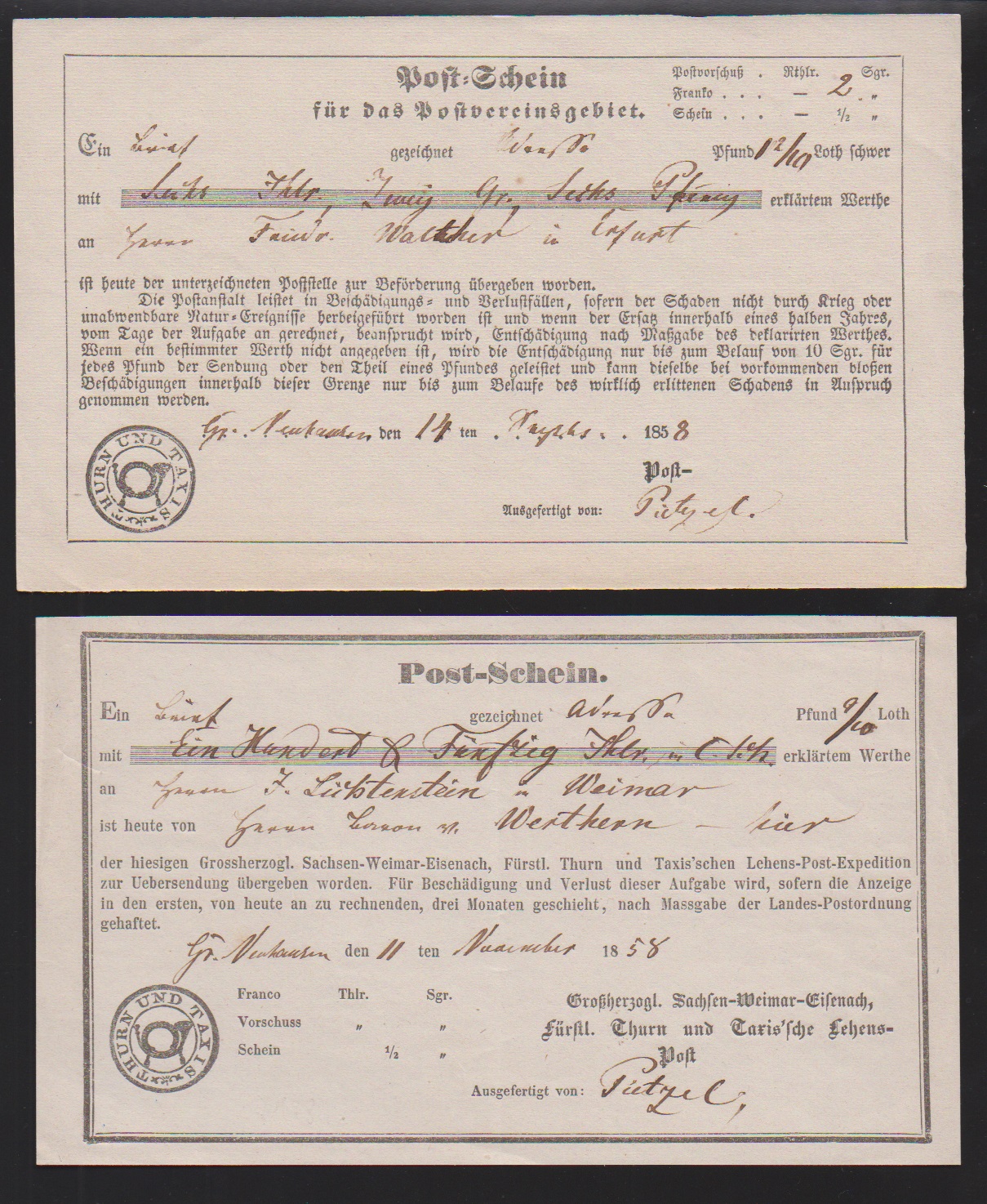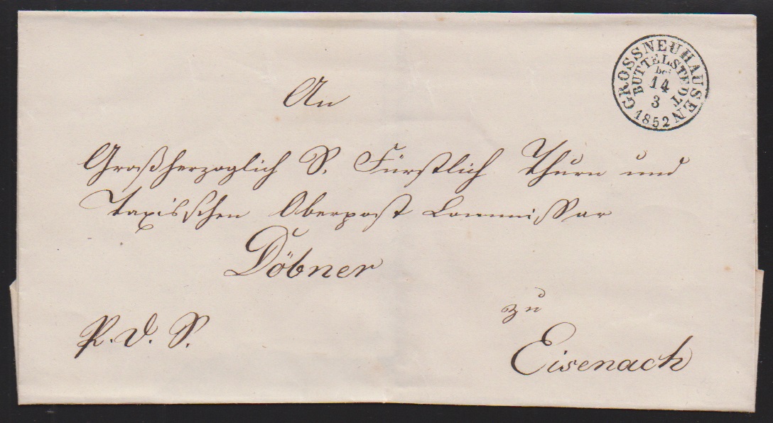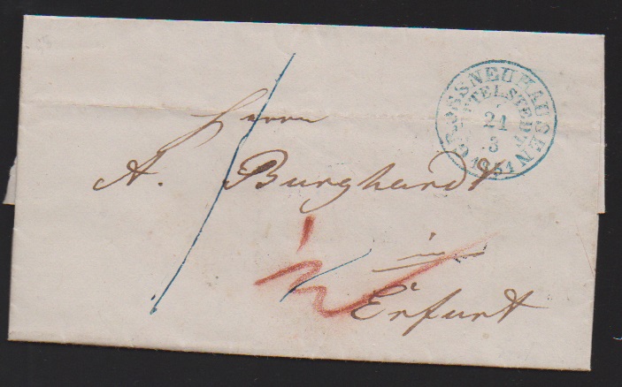 "Grossneuhausen bei Buttelstedt", 1851, früher Abschlag des blauen K1 auf Brief nach Erfurt (aus März vor Gültigkeit des Postvereins-Tarifs), sowie in schwarz auf Luxusbrief 1852