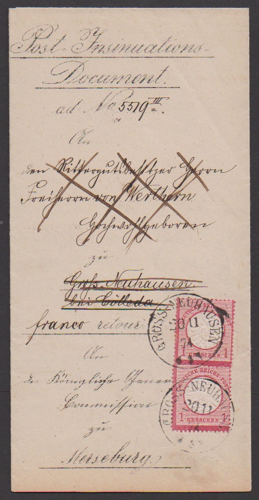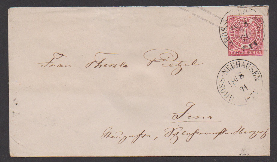 "Grossneuhausen bei Buttelstedt", nachverw. K1 auf Doppelbrief mit zweimal 1 Gr. NDP, sowie der K1 in aptierter Form ("Buttelstedt bei" entfernt) auf Brief 1871 mit 1 Gr. NDP