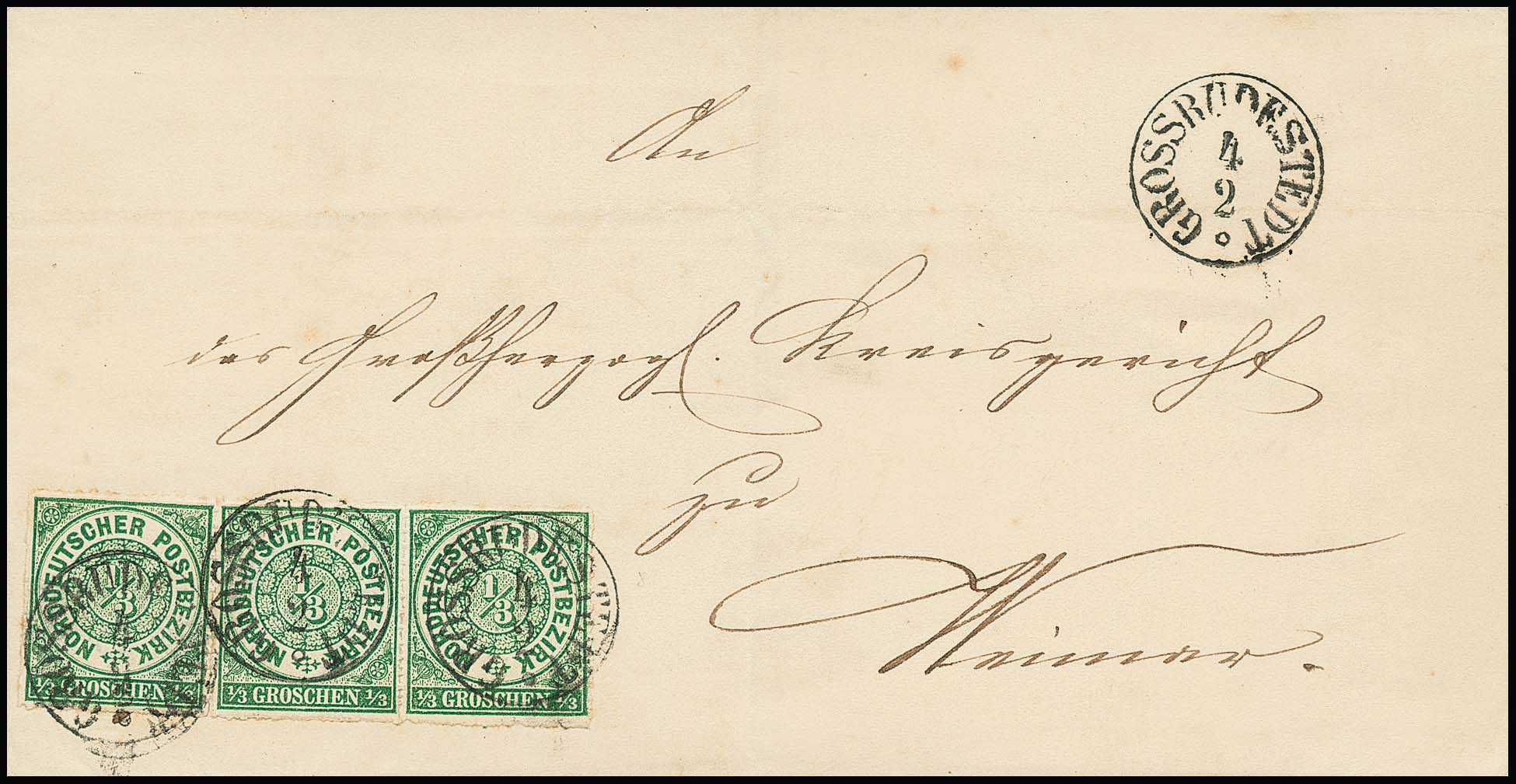 "Grossrudestedt", klarer nachverw. K1 auf Faltbrief mit drei Prachtstücken NDP 1/3 Gr. grün (ein Paar)