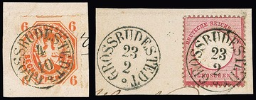"Grossrudestedt", nachverw. K1 klar auf zwei dekor. Briefstücken Preußen 6 Pfge. (kl. Knitter) bzw. 1 Gr. großes Brustschild, sowie auf NDP 1/3 Gr.