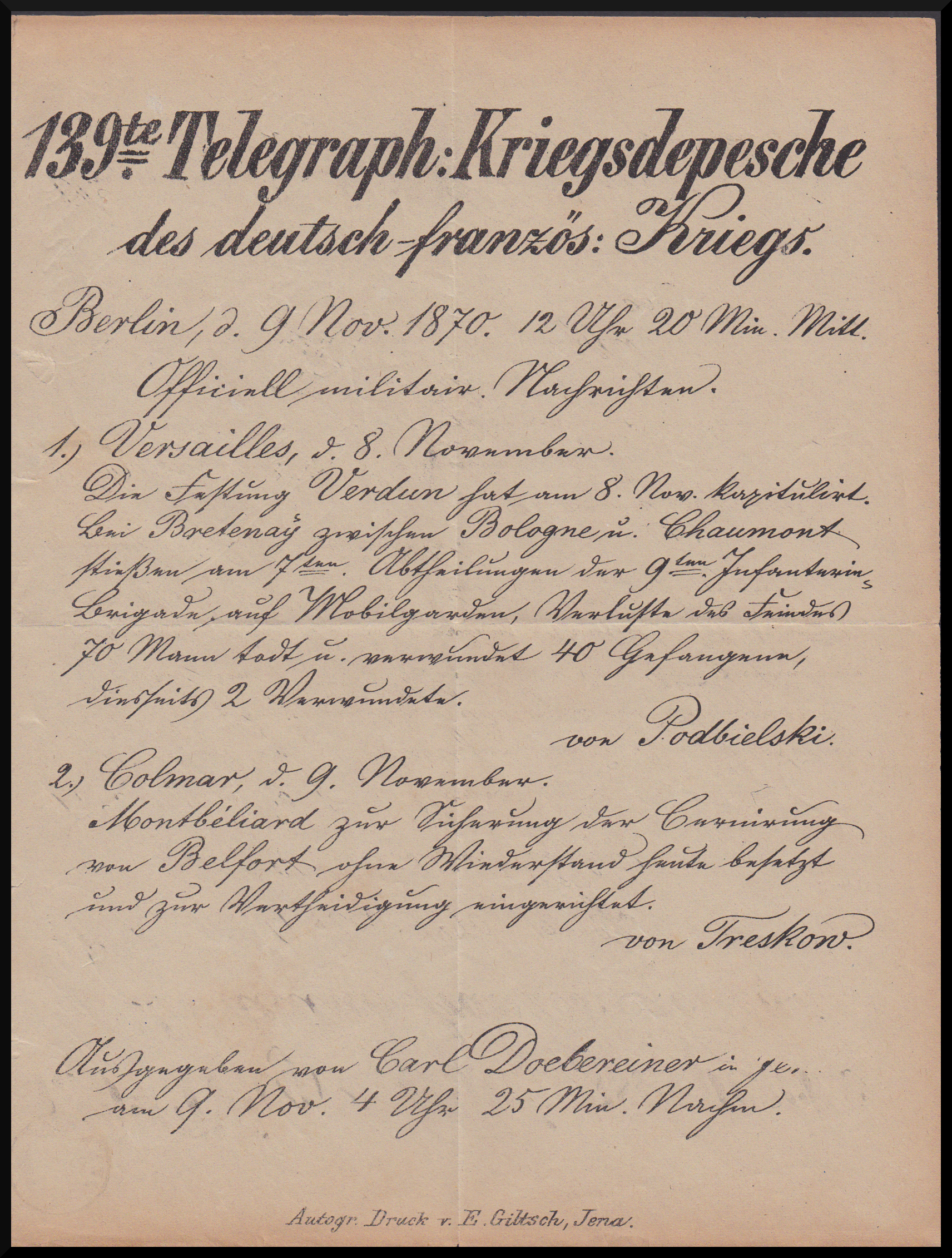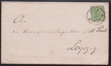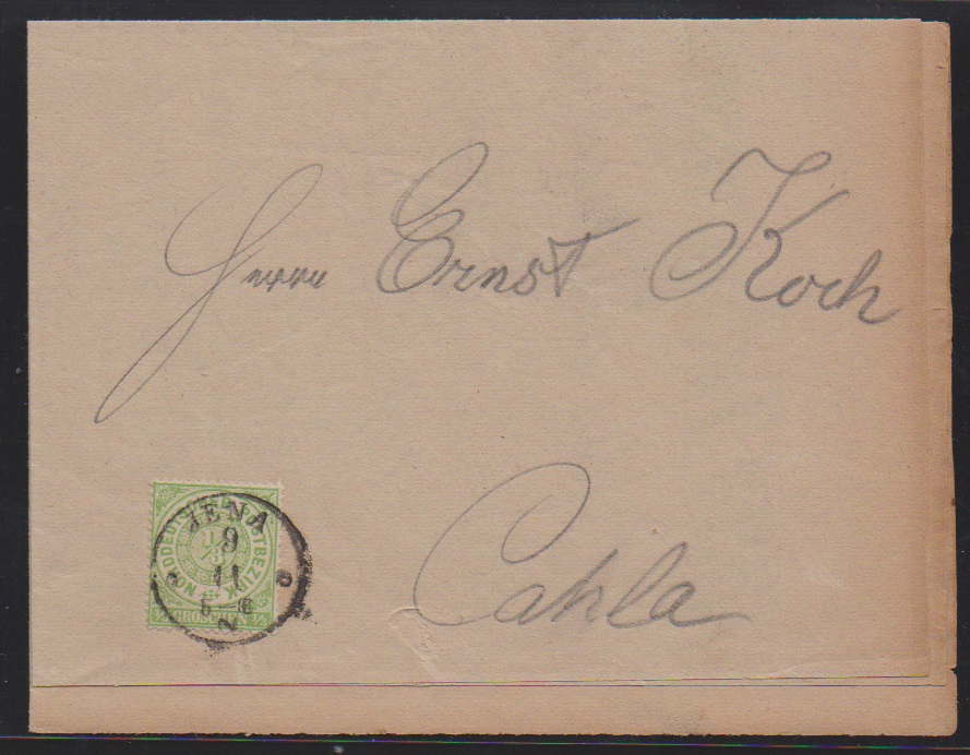 "Jena", nachverw. K1 auf "Kriegsdepesche" 1870, als lithographierte Drucksache (leichte Gebrauchsspuren) mit NDP 1/3 Gr. nach Cahla