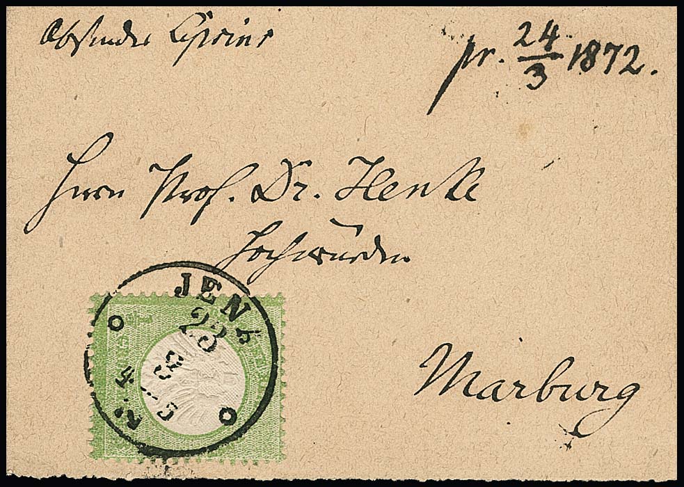 "Jena", nachverw. K1 auf hübscher kleiner Kabinett-Drucksachen-Schleife mit 1/3 Gr. kl. Schild, sowie auf Briefstück mit zweimal 1/2 Gr. kl. Brustschild