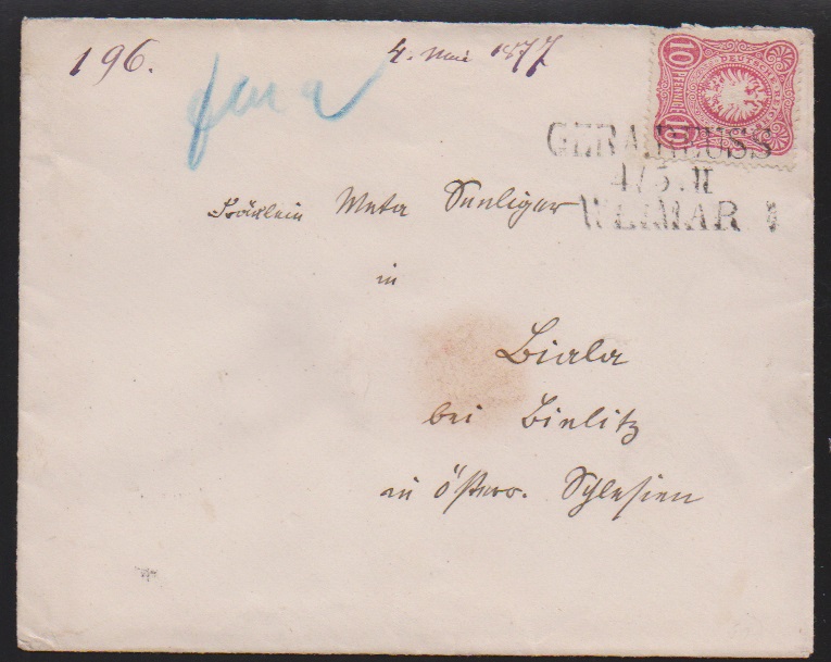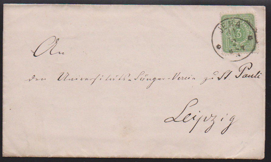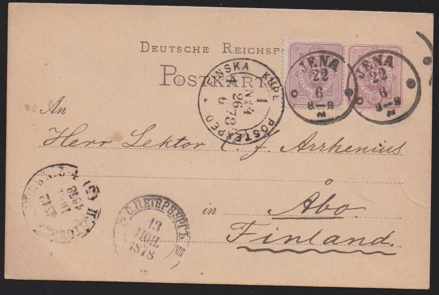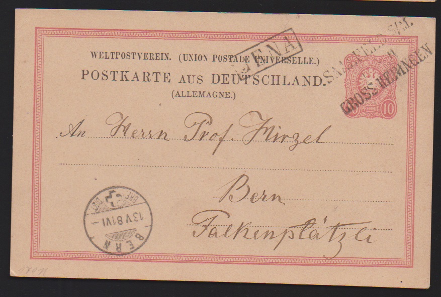 "Jena", vier Pfennig-Belege mit versch. Abstempelungen: Taxis-K1 auf Karte nach Finnland, Ablöse-K1 auf Drucksache, hs. auf Bahnpostbrief, sowie BP-Ra1 auf Auslandskarte