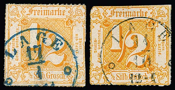 "Lage", K1 in schwarz bzw. blau je klar auf zwei 1/2 Sgr. orange (eine oben Schere)
