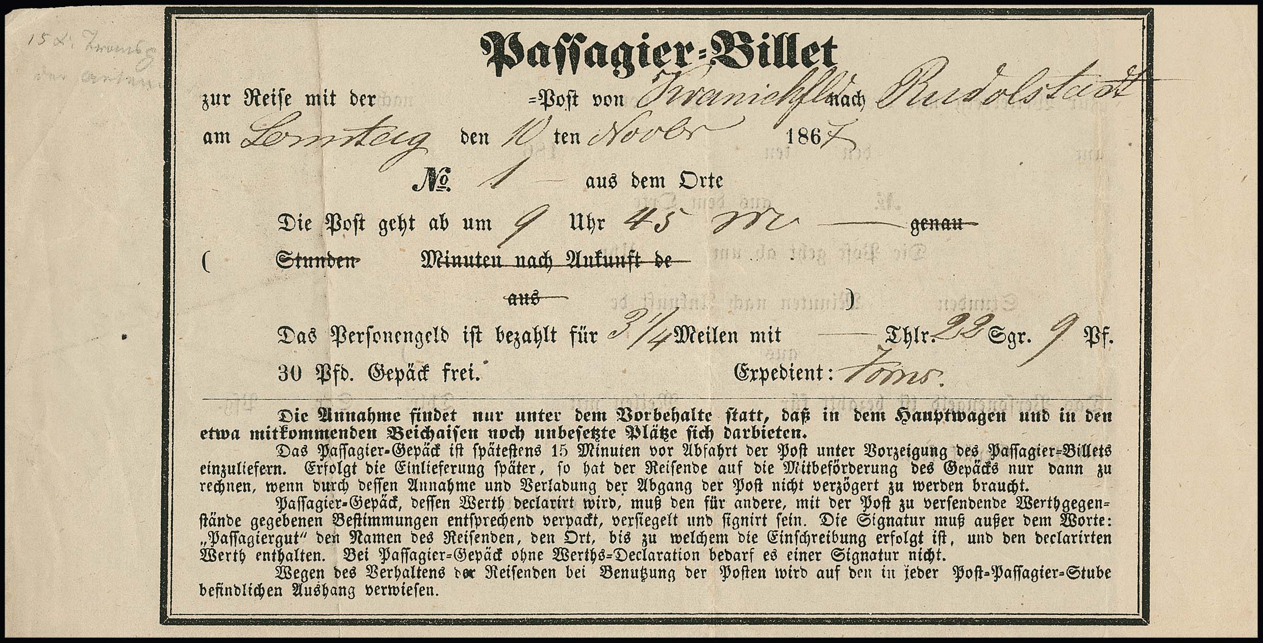 "Kranichfeld", 1867, 10.11., gef. "Passagier-Billet" für eine Reise mit der Postkutsche nach Rudolstadt