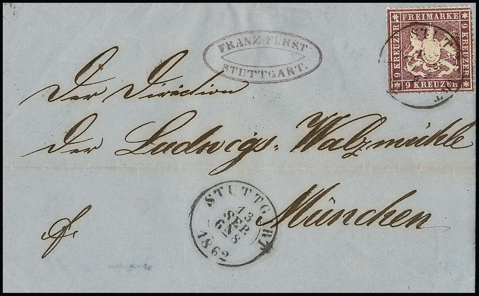 9 Kr. lilarot, tieffarbiges Kabinettstück mit sauber aufgesetztem K2 "Stuttgart 13/9 62" auf Faltbrief nach München. Mi. 900,- +