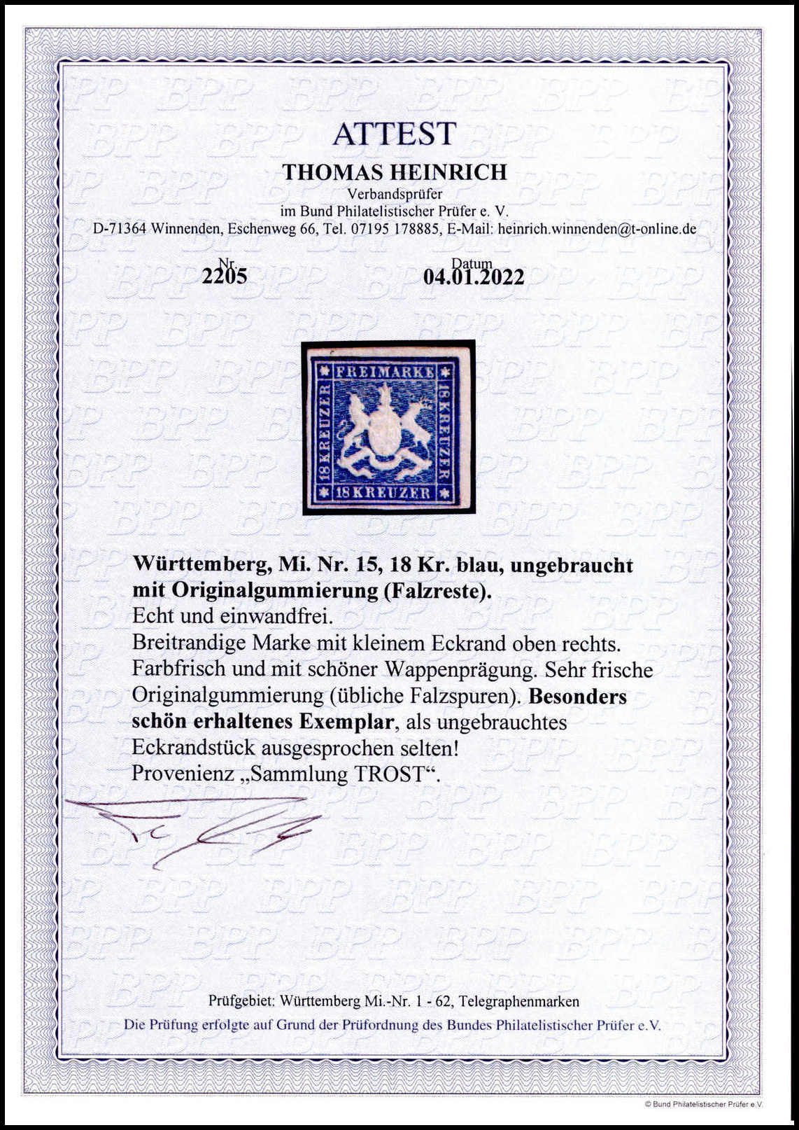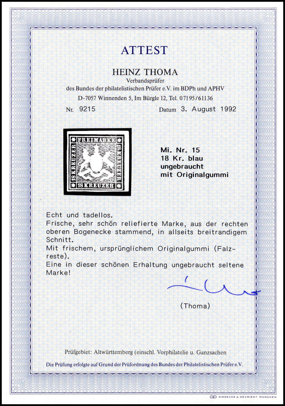 18 Kr. blau, ungebrauchtes Prachtstück, vollrandig geschnitten und in tiefer Farbe mit noch teilweise erhaltenem Originalgummi (dieser ganz leichte Patina im Wappenbereich). Eine seltene Marke in ungebr. Erhaltung, Fotoattest Heinrich. Mi. 4000,-