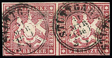 9 Kr. karmin, dunkle Nuance, seltenes gestempeltes Paar (etwas berührt bzw. rechts kl. Randspalt). Mi. 1000,-, Fotoexp. Heinrich "Paare der Marke sind sehr selten"