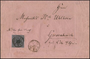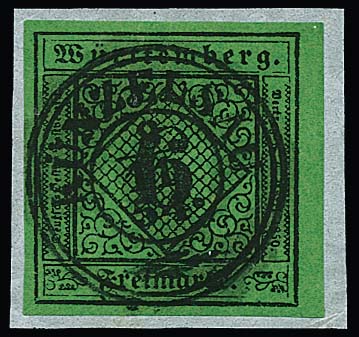 3 Kr. schw./gelb, breitrandiges Kabinettstück als Einzelfrankatur auf sauberem, weißem Brief nach Würzburg (Marke zur Kontrolle gelöst und wieder fixiert), zentrischer, stummer Mühlradstempel von Crailsheim in blau (Michel Type 4) und Neben-L2 "Crailsheim 30. Oct. 1851". Obwohl die Marke oben einen deutlichen Stempelübergang auf den Brief zeigt, ist die Zugehörigkeit zu diesem lt. Attest Heinrich nicht sicher beweisbar, sign. Thoma mit hs. Zusatz "echt und einwandfrei". Mi. + 15.000,-