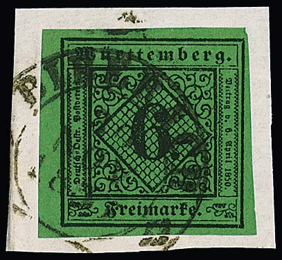 3 Kr. schw./gelb, tadellos geschnittenes Exemplar auf Briefstück (Zugehörigkeit nicht beweisbar) mit zentr. stummem Vierradstempel von Tübingen, sign. Hunziker