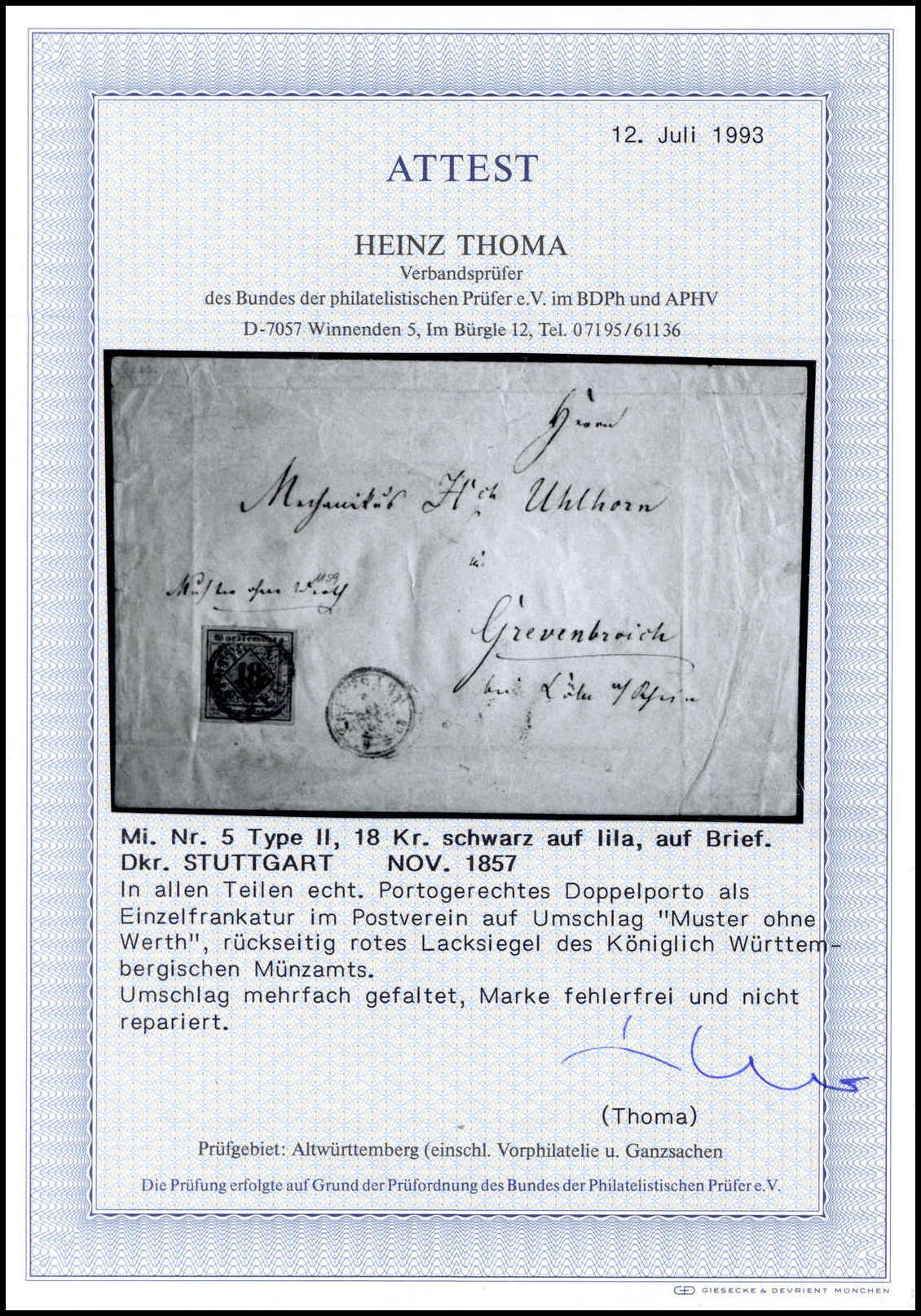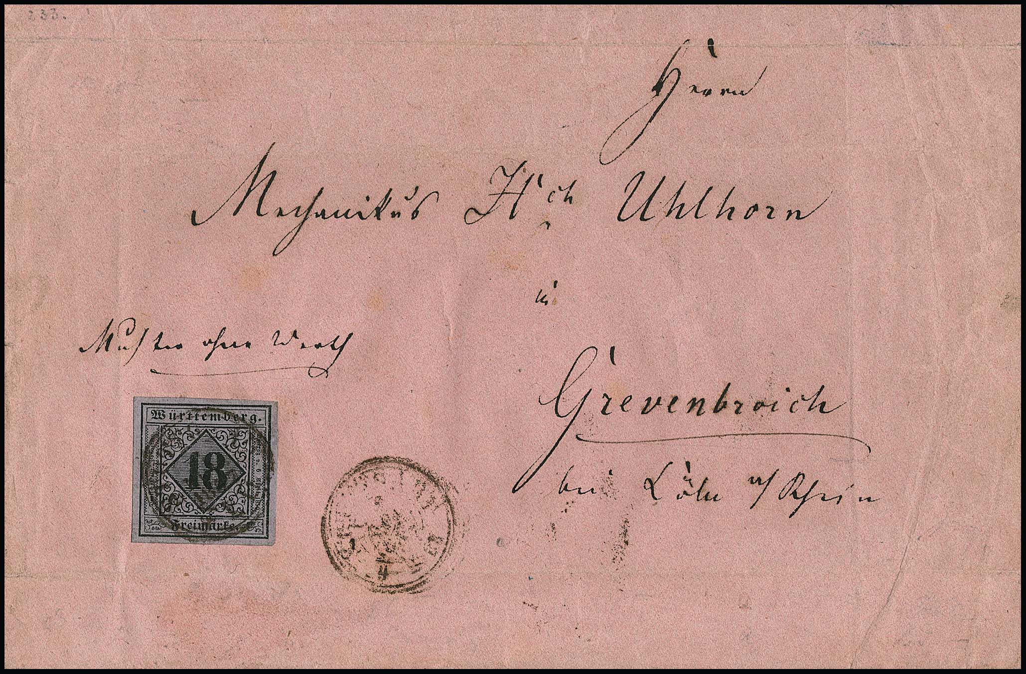18 Kr. schw./violettgrau, Type II, breitrandiges Kabinettstück mit genau zentr. K3 "Stuttgart" auf gef. rosa Couvert in der 2. Gewichtsstufe "Muster ohne Werth" nach Grevenbroich, rs. rotes Lacksiegel des Königlich-Württembergischen Münzamtes. Einzelfrankaturen dieser Marke in der Type II sind Seltenheiten, Fotoattest Thoma. Mi. 4000,- +