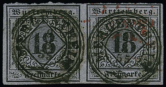 18 Kr. schw./violettgrau, waagerechtes Kabinettpaar, die linke Marke in Type II, die rechte Marke in Type I, vollrandig und in frischer Farbe. Jede Marke mit zentr. K3 "Mergentheim 9/8 55". Typenpaare der 18 Kr. sind nur wenige bekannt geworden, sign. Pfenninger, Fotoattest Heinrich
