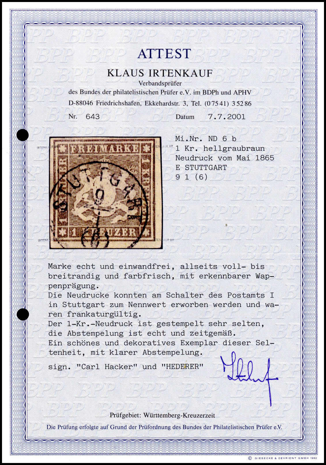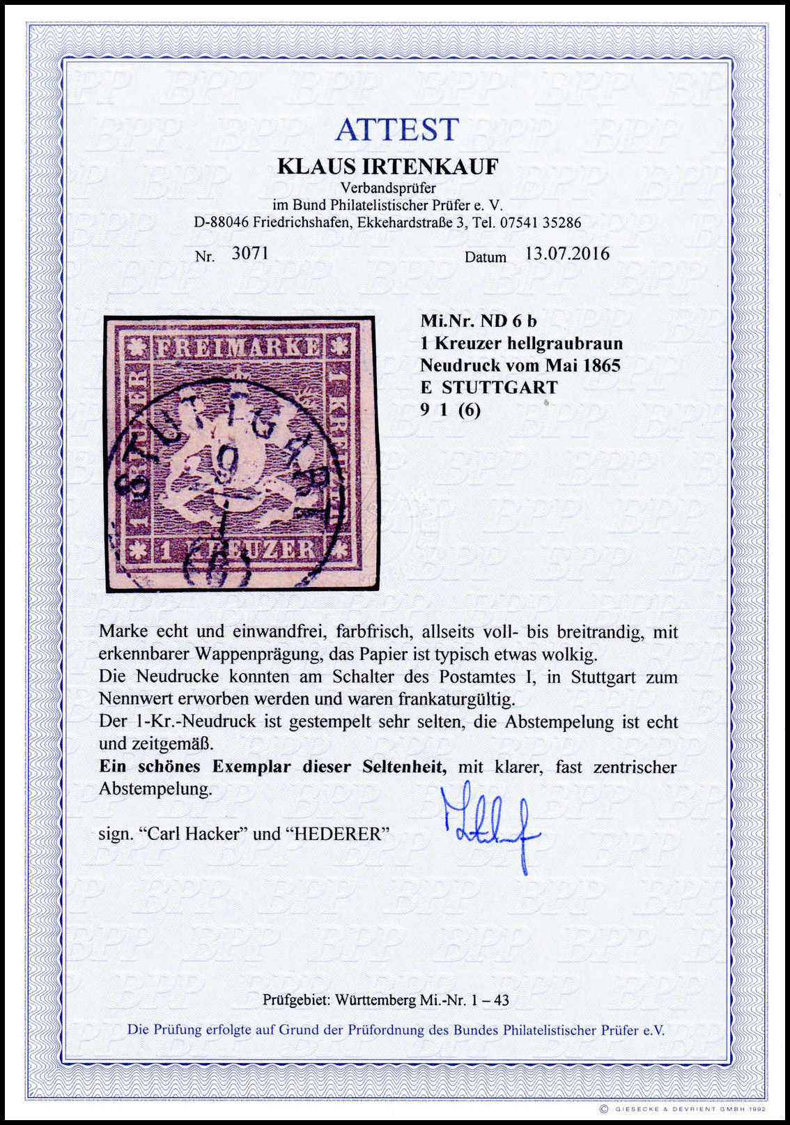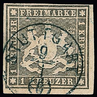 1 Kr. hellgraubraun, amtlicher Neudruck aus Mai 1865, Kabinettstück, perfekt geschnitten und mit klarem K1 "Stuttgart". Die 1865er-Neudrucke warem am Schalter des Postamts I in Stuttgart zum Nennwert zu haben und waren voll frankaturgültig. Es sind nur wenige echt gebrauchte Exemplare bekannt, Fotoattest Irtenkauf