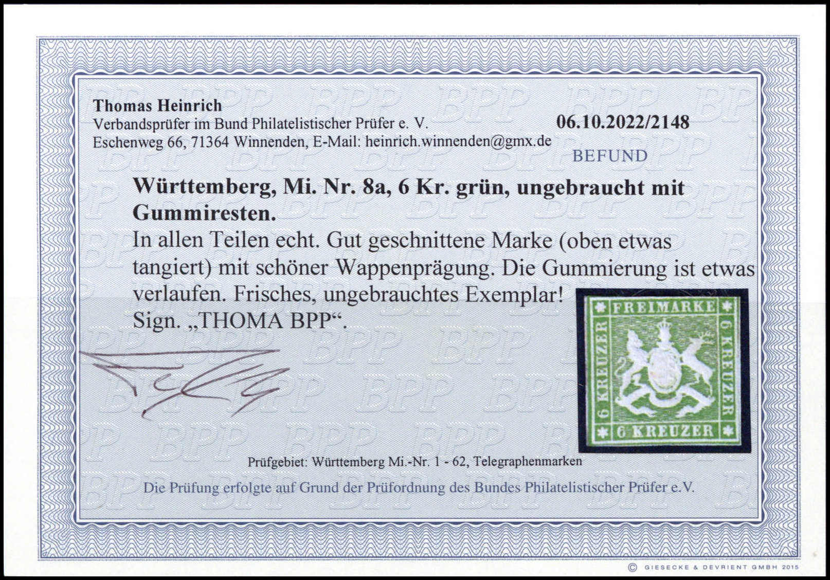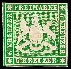 6 Kr. grün, ungebrauchtes Prachtstück in frischer Farbe und mit vollem Originalgummi, oben etwas berührt, sonst vollrandig geschnitten und mit schöner Wappenprägung. Seltene Marke, Fotoexp. Heinrich. Mi. 1000,- +