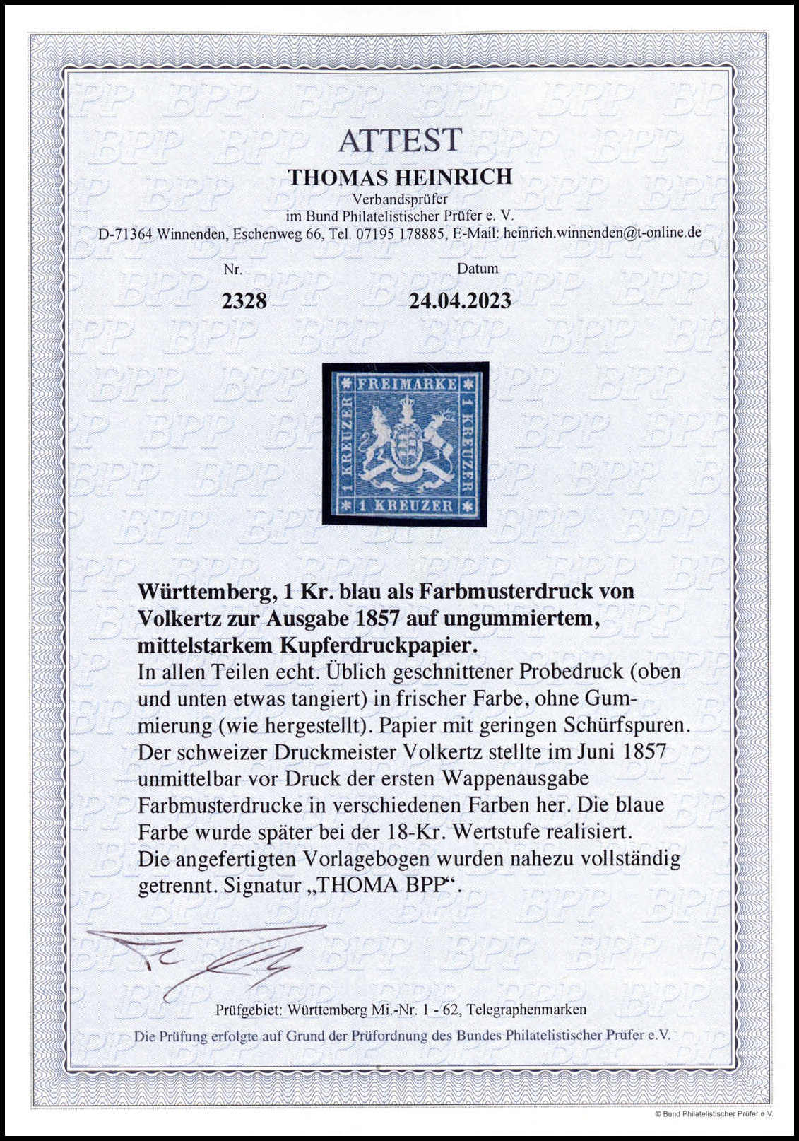 1 Kr. blau, Volkertz`scher Farbmusterdruck auf ungummiertem, weißem Papier (kl. Unebenheiten). Bei diesem Druck in blauer Farbe ist das Wappen in der Markenmitte deutlich mit blauer Farbe ausgefüllt, sign. Thoma, Fotoattest Heinrich