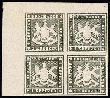 1 Kr. gräulichbraun, Neudruck von 1865 im Viererblock aus der linken oberen Bogenecke, ein Wert postfrisch