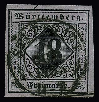 18 Kr. schw./violettgrau, breitrandiges Prachtstück mit zentr. K2 "Stuttgart" (ganz leichte Druckfalte), Mi. 900,-