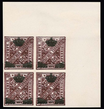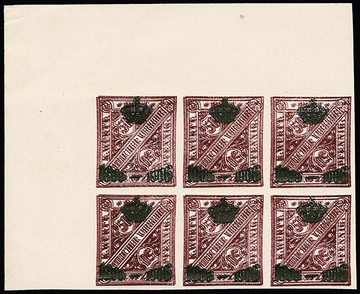 50 Pfg. Krönchen-Aufdruck mit Doppeldruck der Urmarke und des Aufdrucks im ungebrauchten Sechserblock aus der linken oberen Bogenecke