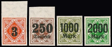 Krönchen-Aufdrucke, vier versch. ungezähnte Andruck-Viererblöcke (einmal ein Wert wieder eingefügt) je auf Kanzlei-Papier, 10 Pfg. und 50 Pfg. (re. obere Ecke) je mit Doppeldruck der Urmarke, sowie zwei 20 Pfg. (einmal DD), selten!