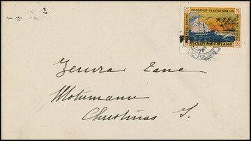 Gilbert- u. Ellice-Inseln, 1918, 5 C., mehrfarbige Marke der Central Pacific Coconut-Plantations-Gesellschaft auf Inselcouvert von Kiritimati ("Christmas Island") mit zusätzlichem Datums-L1, Michel "-.-"