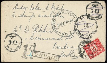 Neuseeland, 1937, Brief von der Raoul-Insel (früher "Sunday Island"), der aufgrund von Markenmangel auf der weitgehend unbewohnten Insel unfrankiert blieb, via Christchurch nach Schottland, versch. Nachportostempel und mit 1 P. Nachporto nachfrankiert. Post von dieser kleinen Pazifik-Insel ist sehr selten!