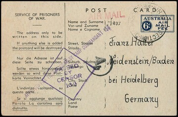 Australien, 1943/44, sowohl Kriegsgefangenen-Ganzsachenkarte zu 6 P. als auch Kartenbrief "Service of Prisoners of War" zu 1 P. je bedarfsgebraucht mit Zensur nach Deutschland