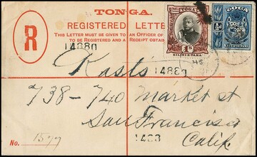 Tonga, 1899, 1/2 P. und 1 Sh. auf Einschreibe-Ganzsache 4 Sh., nach San Franzisko gelaufen, Gebrauchserhaltung