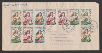 Französ. Polynesien, 1966, 12 Werte der Erstausgabe inkl. dem Höchstwert 20 Fr. vs./rs. auf R-Brief von Papete/Tahiti nach Bayern
