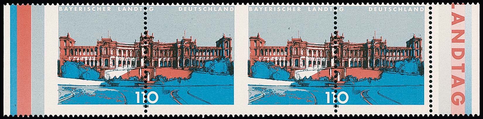 110 Pfg. Bayerischer Landtag im postfrischen Paar mit extrem versetzter Zähnung, dadurch linke Marke nur einmal mittig gezähnt und seitlich ungezähnt, siehe Foto