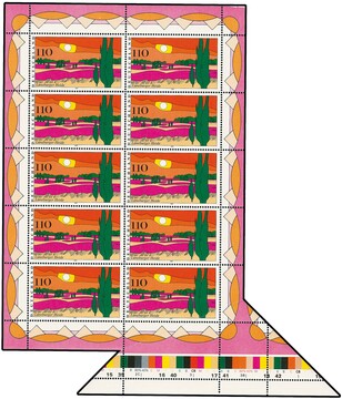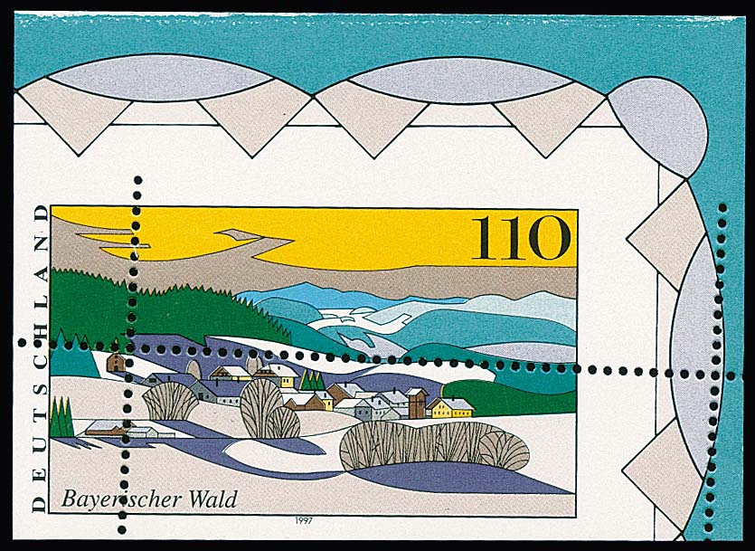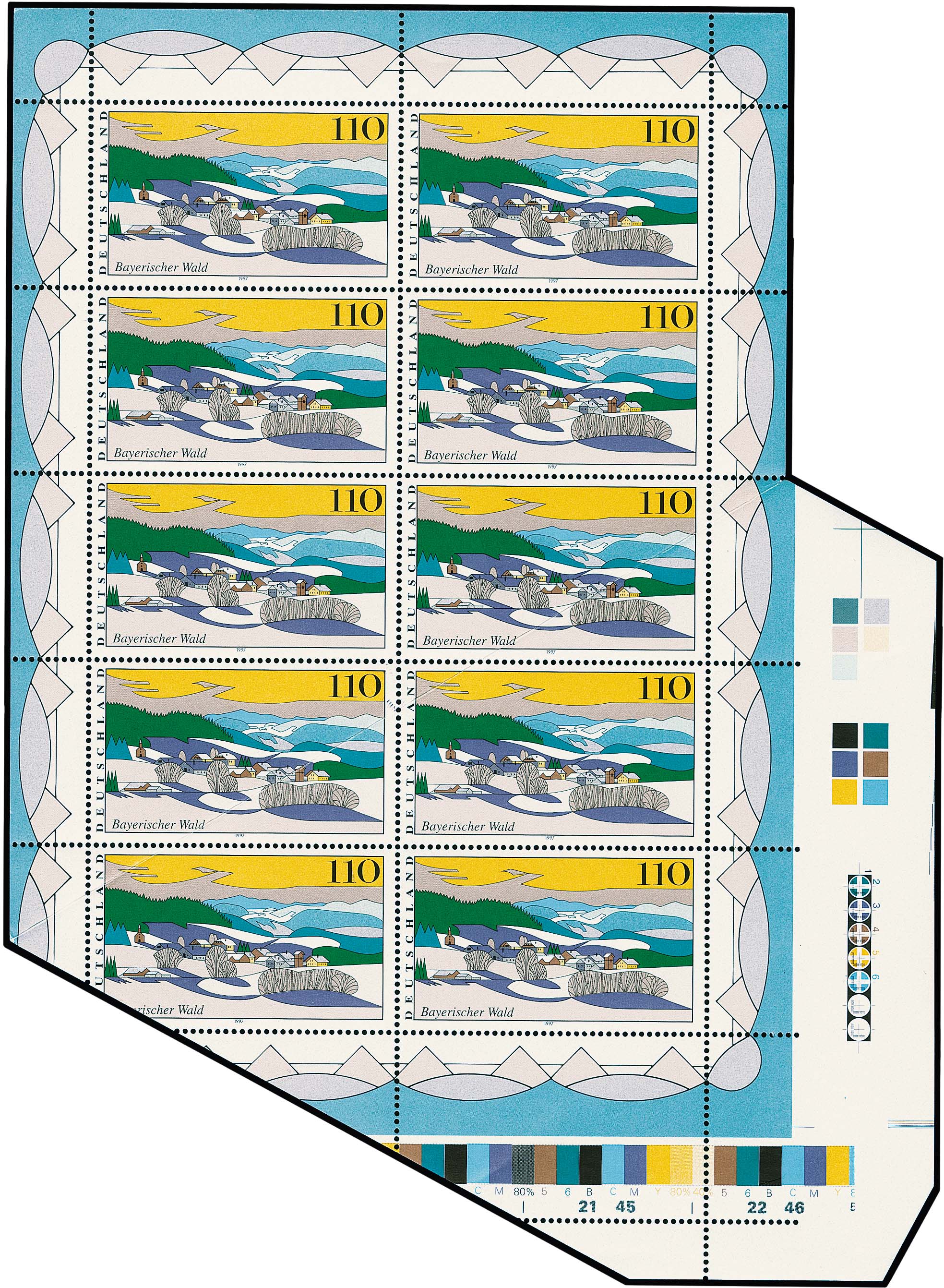 110 Pfg. Bayerischer Wald im kompletten postfrischen Zehner-Bogen, durch Bogenumschlag mit extremem Verschnitt sowie unten und rechts mit Druckmarkierungen im Rand