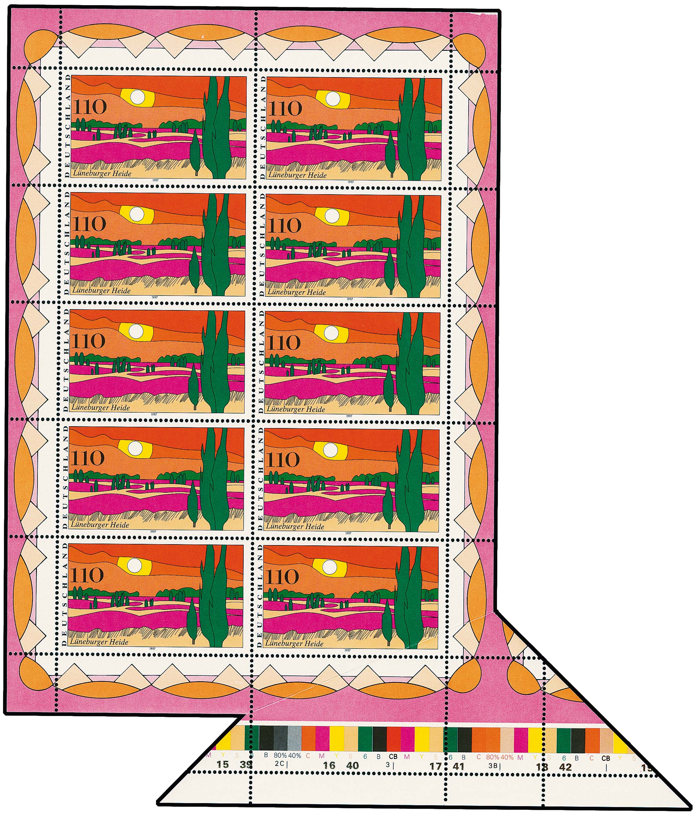 110 Pfg. Lüneburger Heide im kompletten postfrischen Zehner-Bogen, durch Bogenumschlag mit extremem Verschnitt sowie unten und rechts mit Druckmarkierungen im Rand