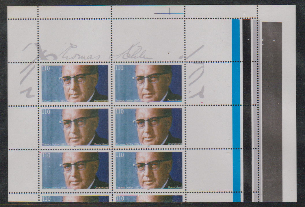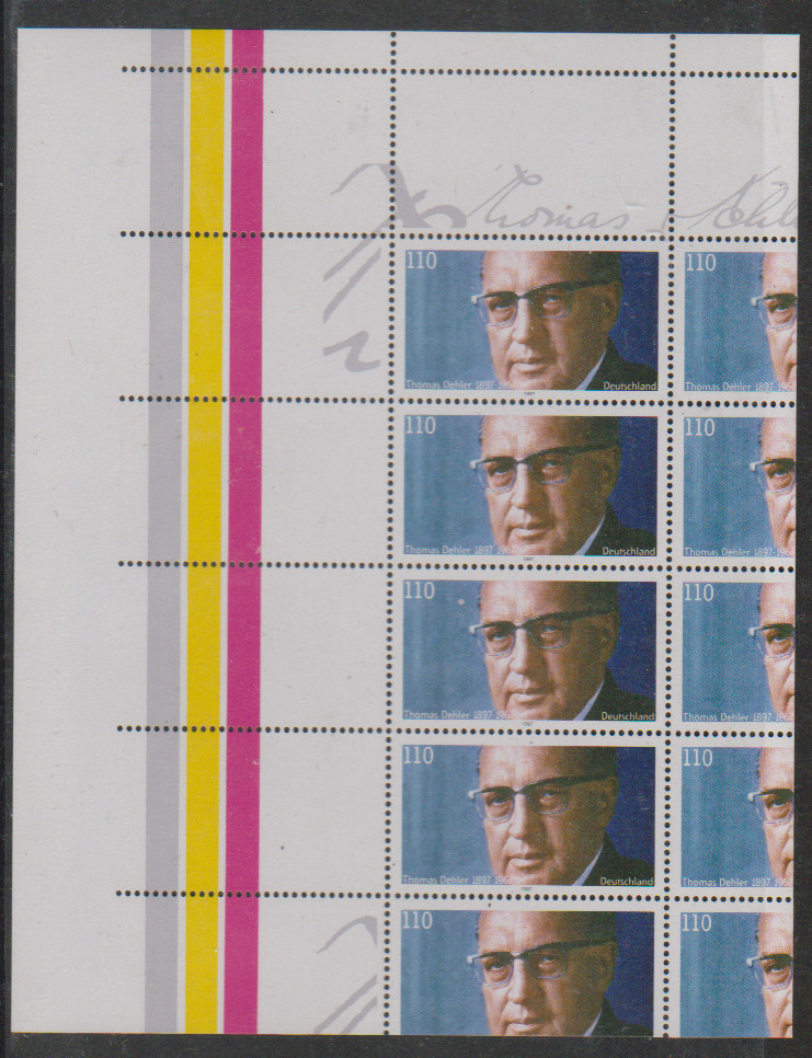 110 Pfg. Thomas Dehler, zwei verschiedenartig völlig verzähnte Zehnerbögen je mit komplettem Randdruck links bzw. rechts sowie Leerfeldern oben und rechts bzw. oben und links