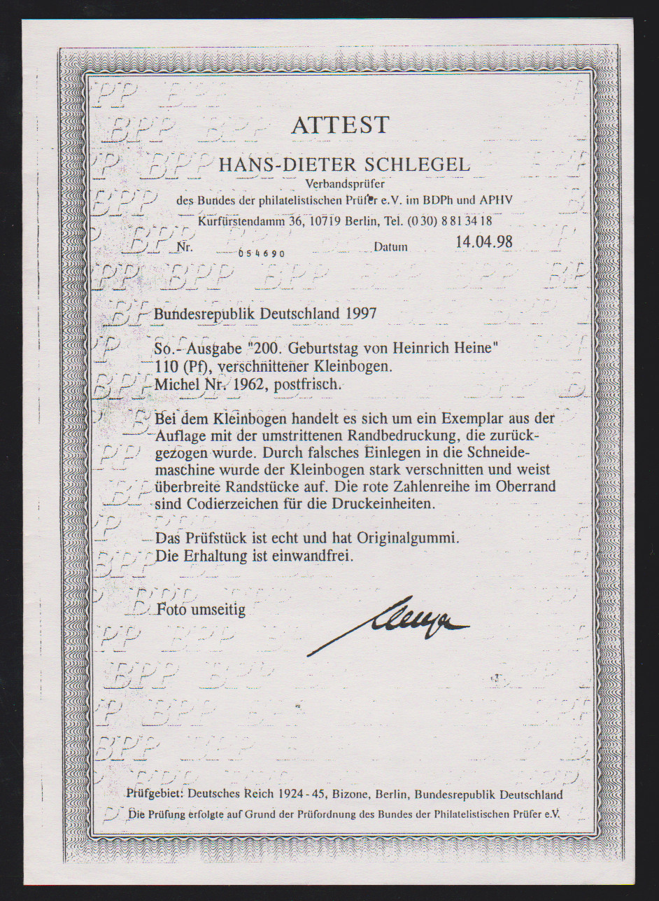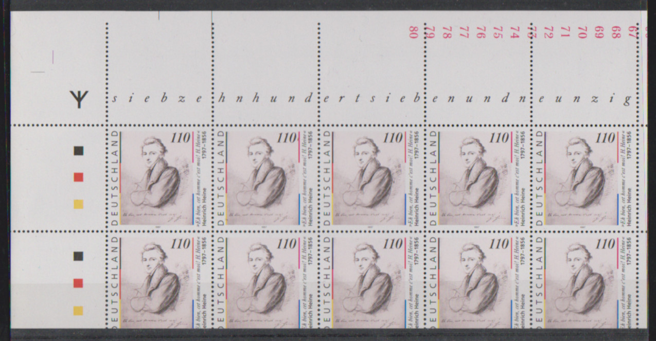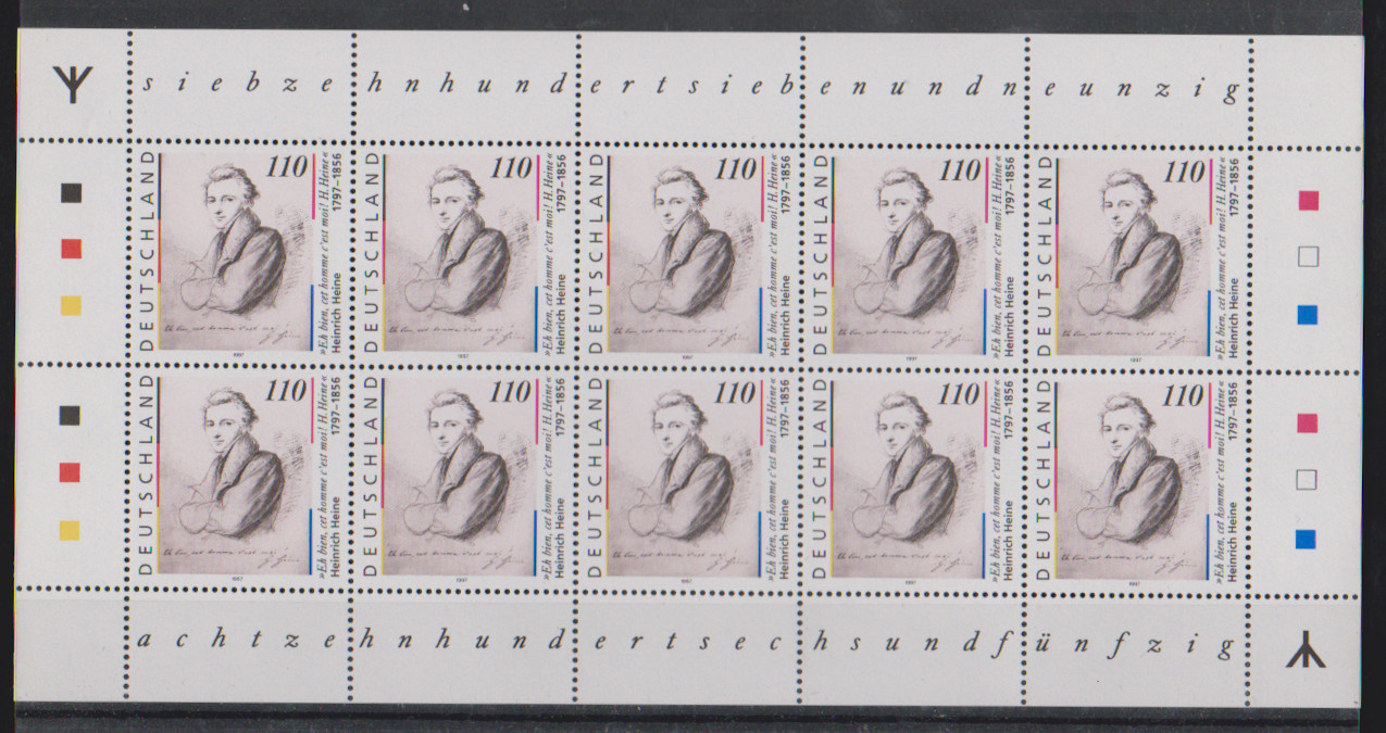 110 Pfg. Heine, einmal normaler postfrischer Kleinbogen "mit Rune", sowie durch Verschnitt völlig verzähnter Kleinbogen mit Leerfeldern in Markengröße oben und gedruckten Randzahlen