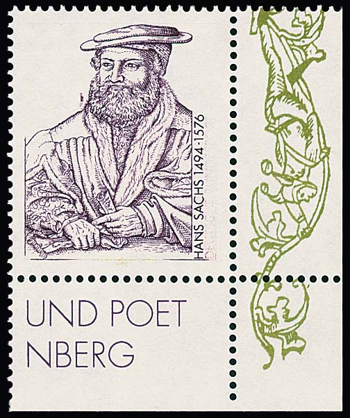 100 Pfg. Hans Sachs, postfrische rechte untere Bogenecke mit Abart "ohne Inschrift und Wertangabe"