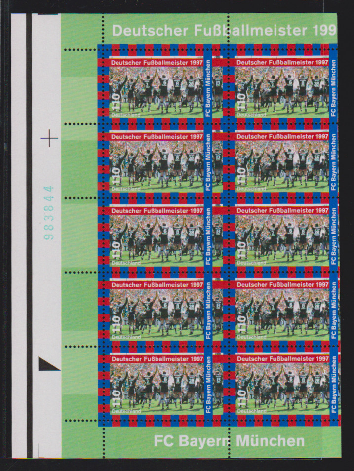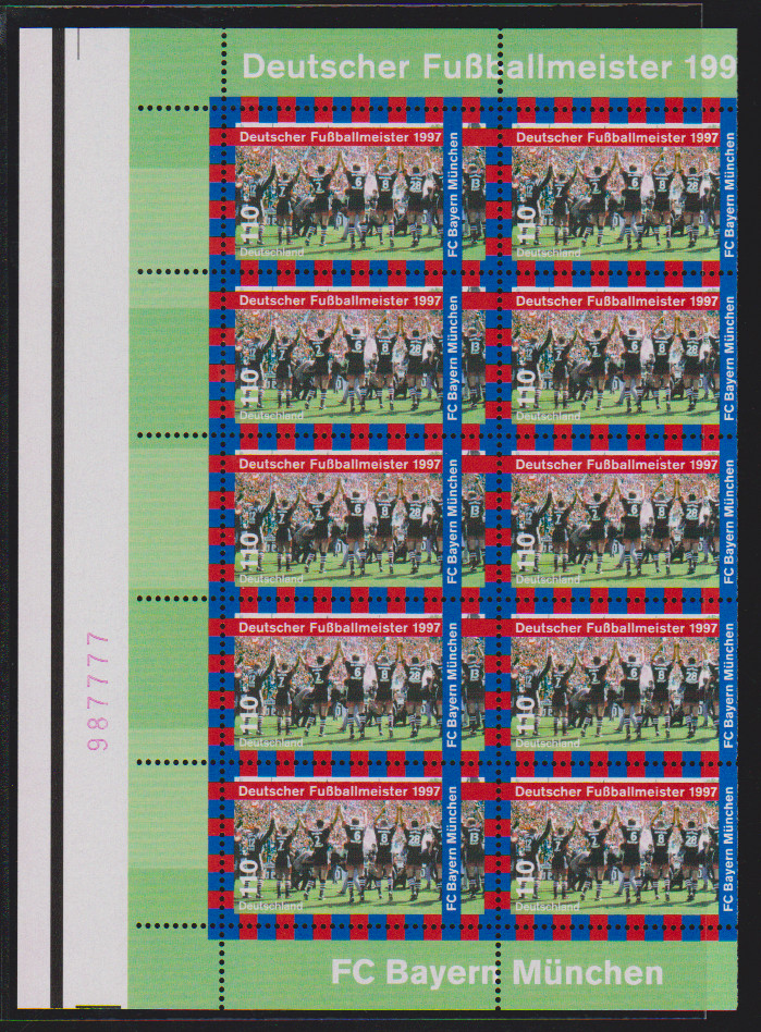 110 Pfg. Bayern München, zwei völlig verschnittene Zehnerbögen postfrisch mit unterschiedlichen Randdrucken links und roter bzw. grüner Rand-Nr.