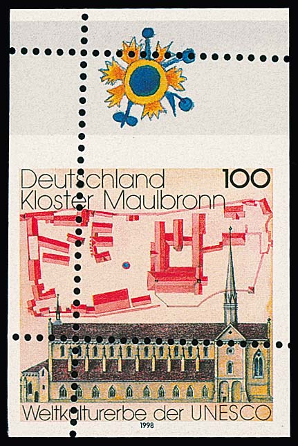 100 Pfg. Kloster Maulbronn, Abart "völlig verzähnt, dadurch teils geschnitten", postfrisch, siehe Foto (nebst Normalmarke)