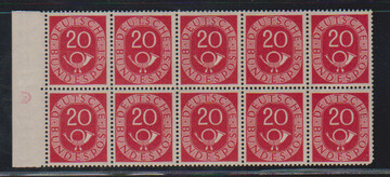 20 Pfg. Posthorn im postfrischen Zehnerblock vom linken Rand (re. untere Marke "eckrund"), dabei im Rand Abklatsch des Druckerzeichens "5" neg., sign. Schlegel