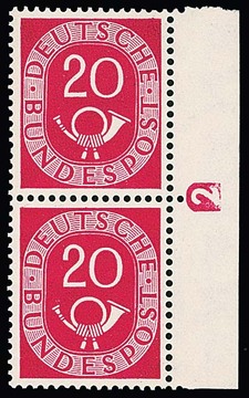 20 Pfg. Posthorn, senkrechtes postfrisches rechtes Randpaar mit Druckerzeichen "2" neg. (ein Wert kl. Spalt), dazu 4 Pfg. im Viererblock aus der linken oberen Bogenecke mit DZ "8" neg. und vollem Originalgummi, so dass der Bahnpoststempel "Kassel-Bebra" möglicherweise ein nachträglicher Gefälligkeitsstempel ist (lt. Notiz Schlegel nicht mit Sicherheit als echt zu bestätigen)