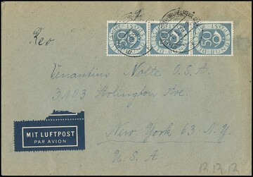 50 Pfg. Posthorn, elf Belege inkl. drei versch. EF, u.a. auf Lupokarte, MeF per zwei und drei auf zwei Überseebriefen, MiF mit guten Werten etc.