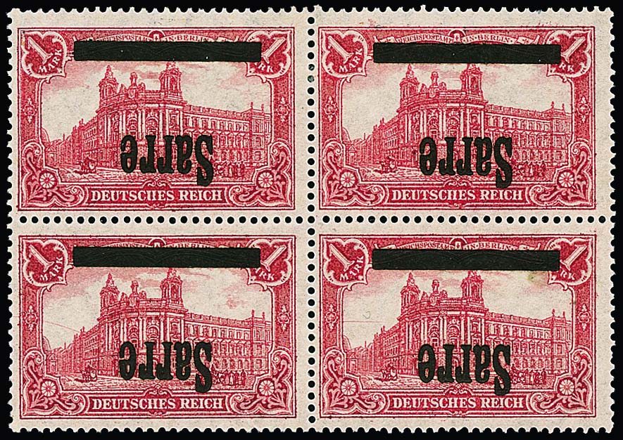 1 Mk. Germania-"Sarre", kopfstehender Aufdruck von Überdruckplatte 1a, im ungebrauchten Viererblock, zwei min. verkürzte Zähne im Attest Burger nicht bemängelt (... in vorzüglicher, frischer Erhaltung."), Mi. lose 3600,-