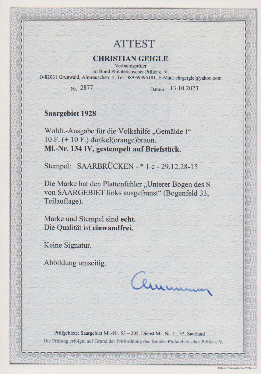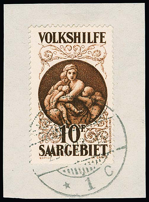 10 Fr. Volkshilfe 1928 mit Plattenfehler "unterer Bogen des S von SAARGEBIET links ausgefranst", von Bogenfeld 33 einer Teilauflage, auf Luxusbriefstück mit Stempel "Saarbrücken". Eine sehr seltene Marke, Attest Geigle. Mi. 10.000,-