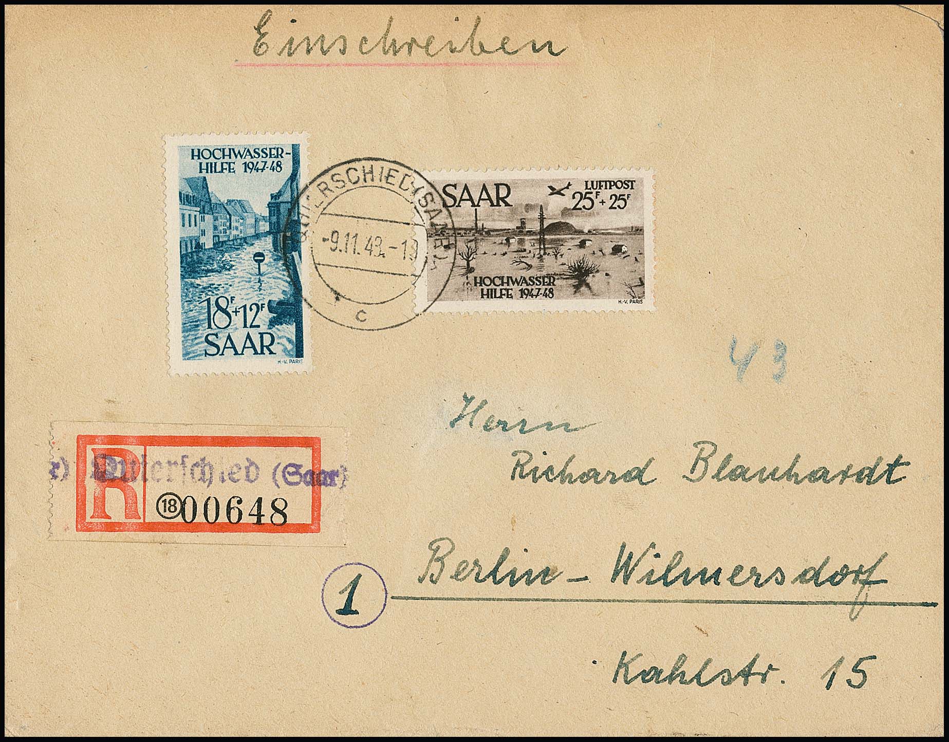 18 + 12 und 25 + 25 Fr. Hochwasserhilfe, beide Höchstwerte auf gelaufenem R-Brief von Quierschied 1948 nach Berlin
