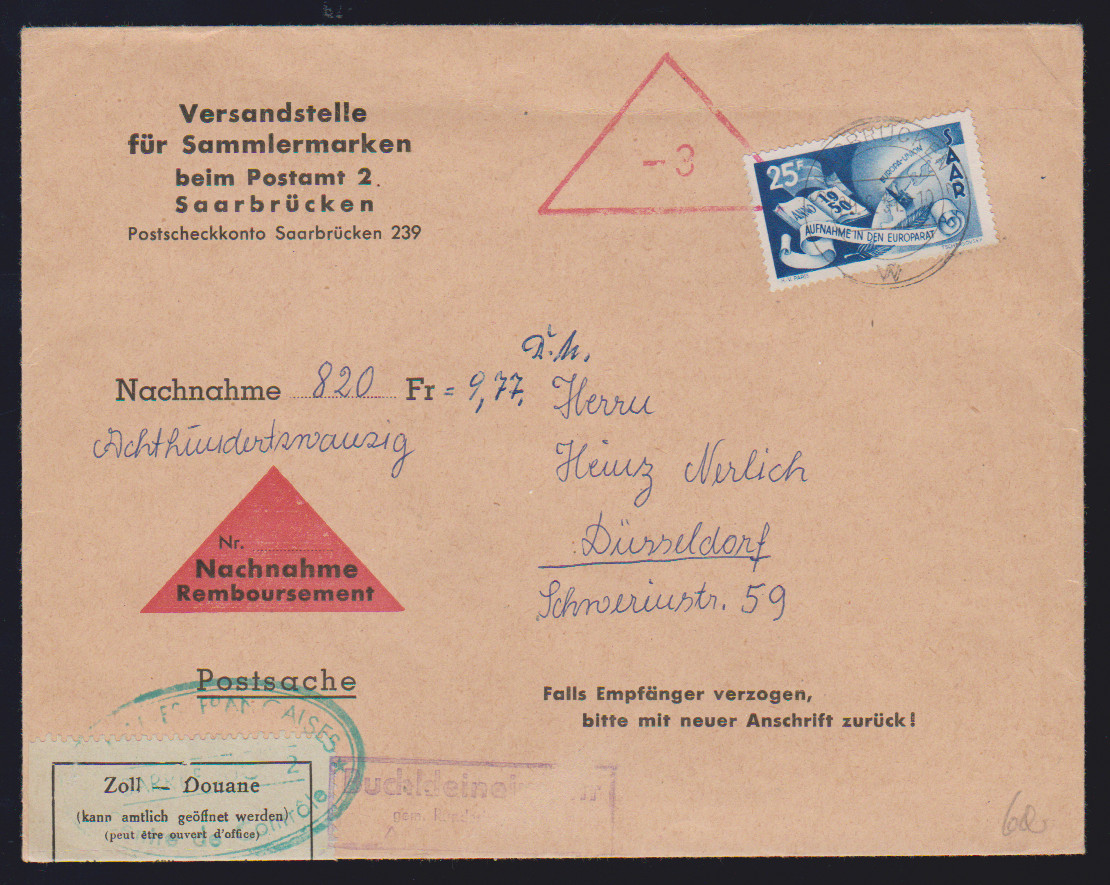 25 Fr. Europarat als EF auf NN-Brief der Versandstelle für Postwertzeichen aus Saarbrücken 1951
