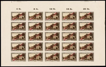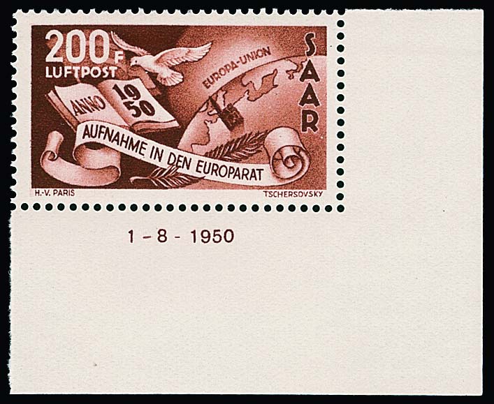 15 Fr. Tag der Briefmarke, rundgestempelte rechte untere Bogenecke mit Druckdatum, Mi. 500,-