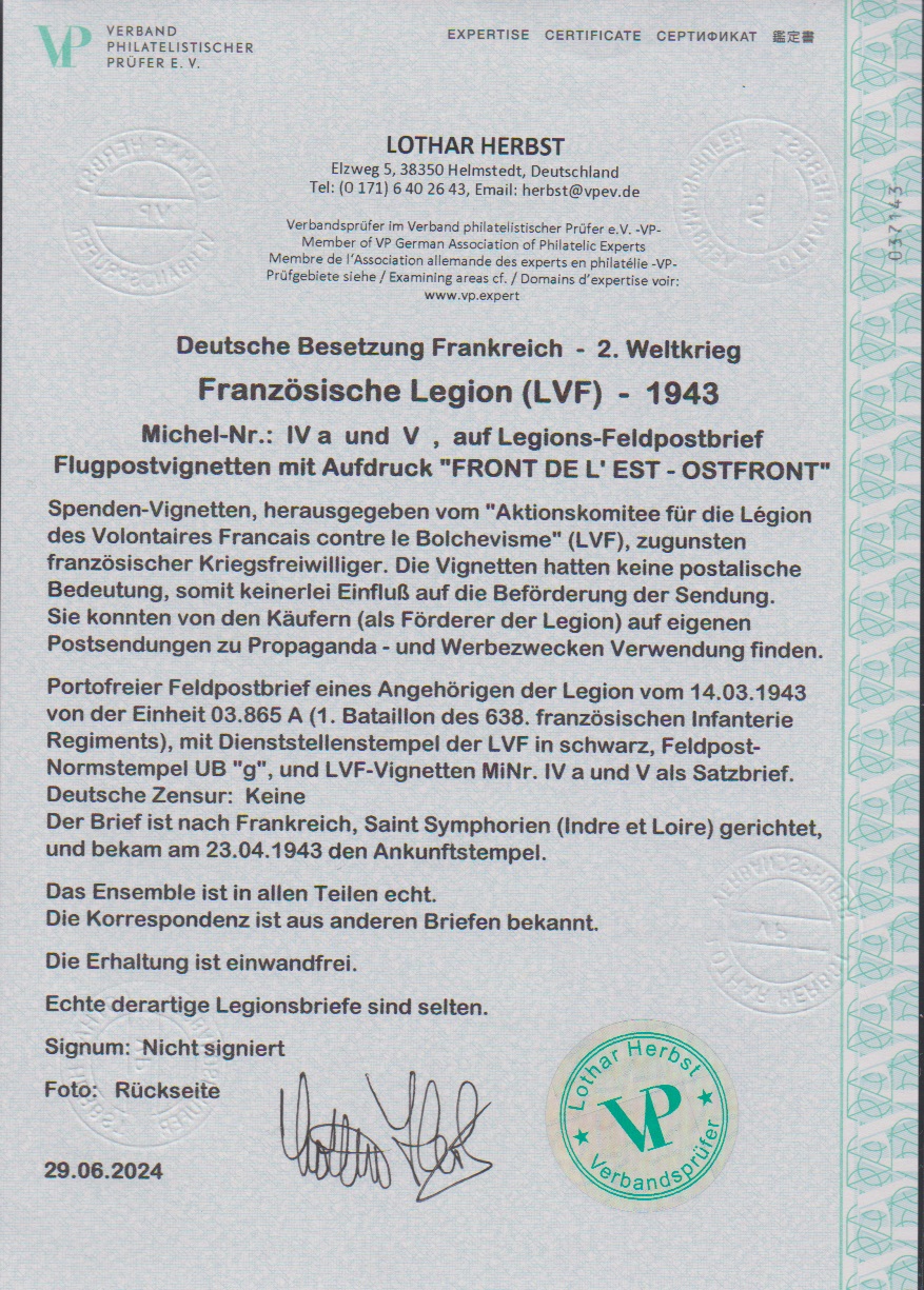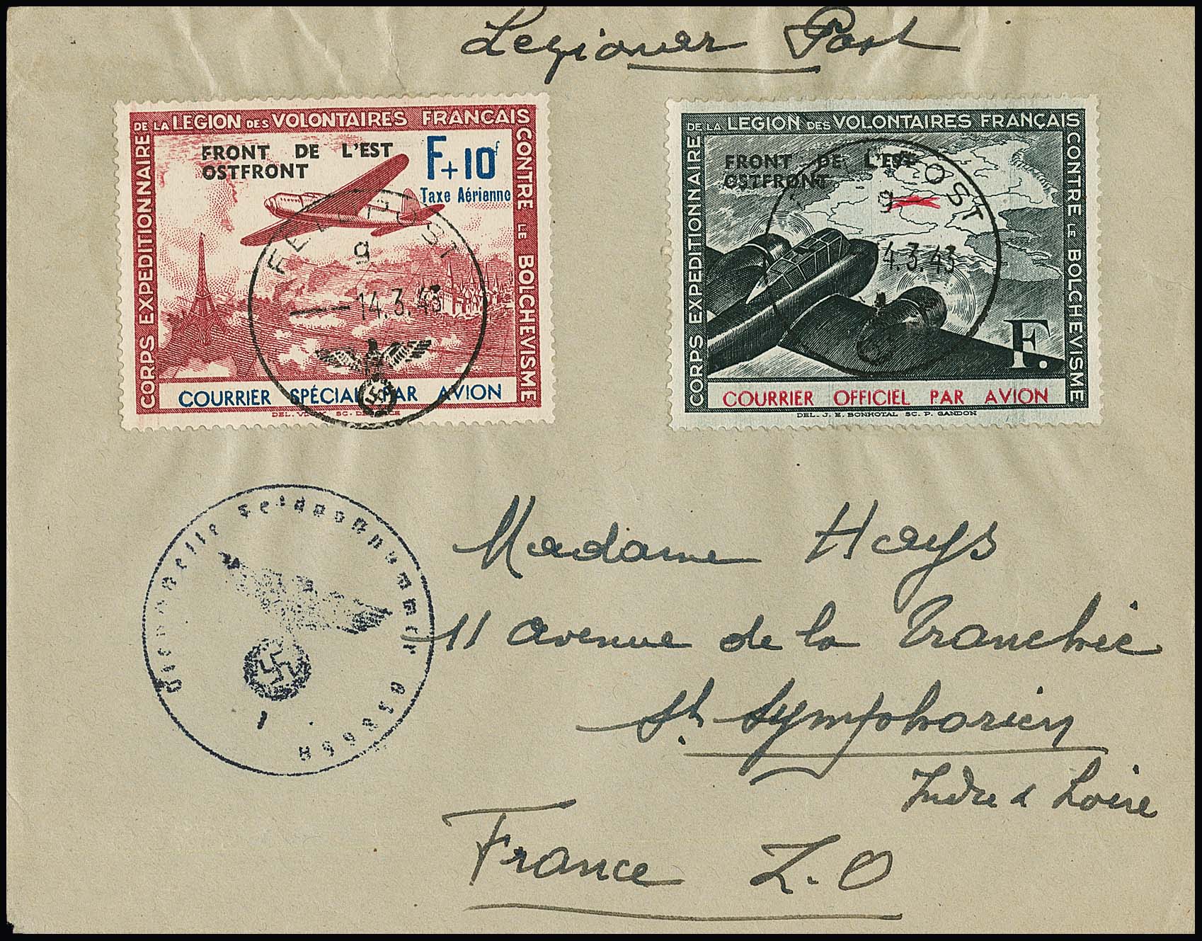Legionsausgaben, Flugpostvignetten komplett auf gelaufenem Feldpostbrief von einem Angehörigen der Legion, 14.3.1943, nach Frankreich. Attest Herbst "Einwandfrei. Echte derartige Legionsbriefe sind sehr selten".