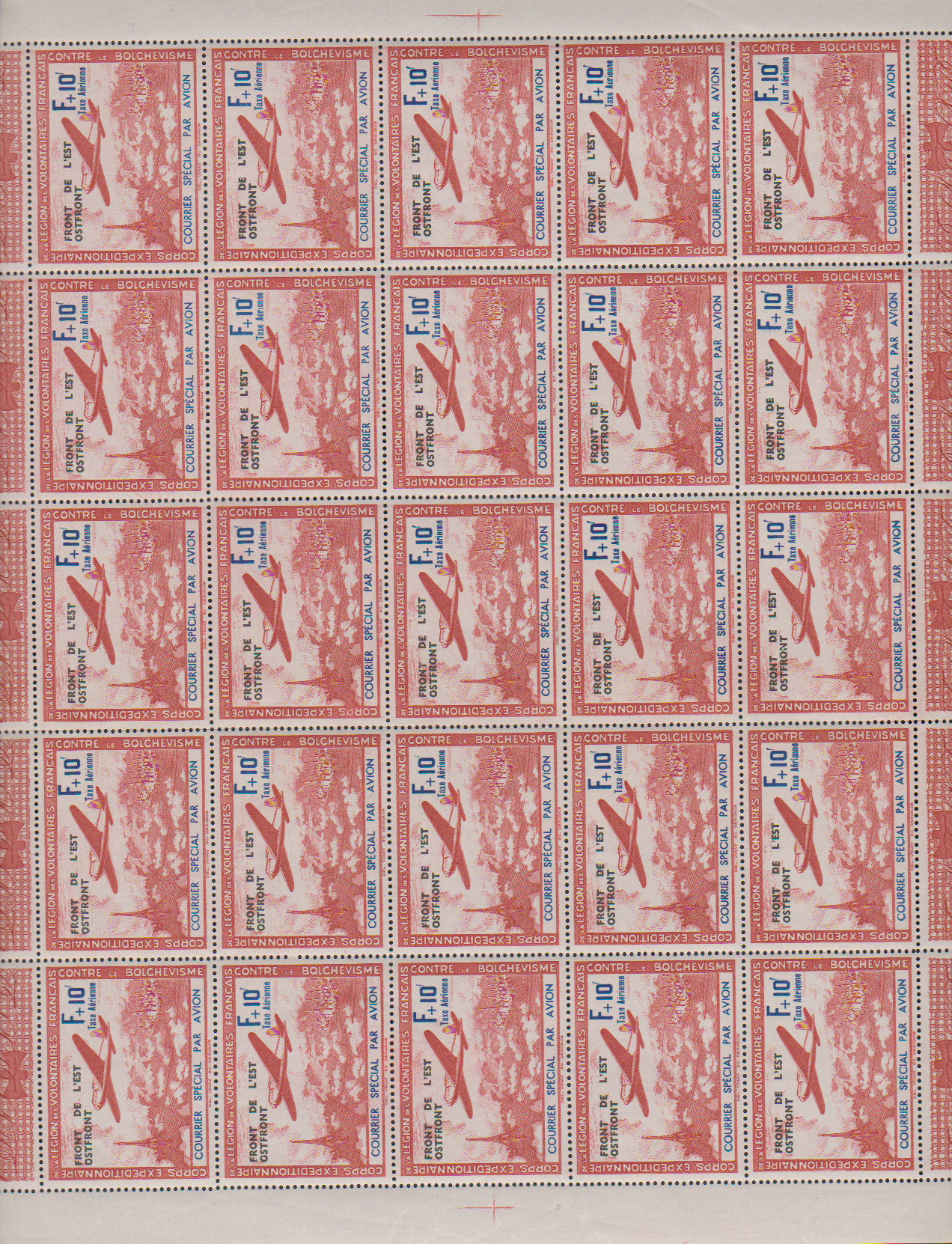 Frankreich, Legionsausgaben, Flugpostvignetten im kompletten postfrischen (typisch gering angetrennten) Bogensatz, dabei der Wert Nr. V mit allen Plattenfehlern, I, II, III, IV und V, was nur bei einer Teilauflage vorkommt. Mi. lose 2460,- +, als Bogensatz selten!