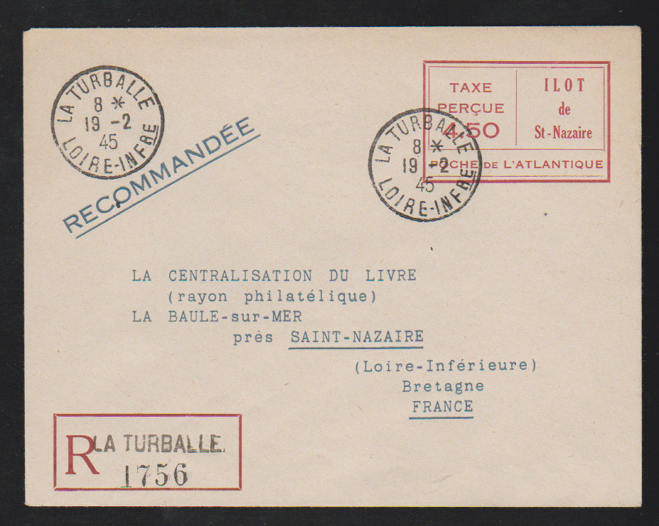 St. Nazaire, Ganzsache 4,50 Fr. als Einschreibebrief von La Turballe gelaufen, 19.2.45