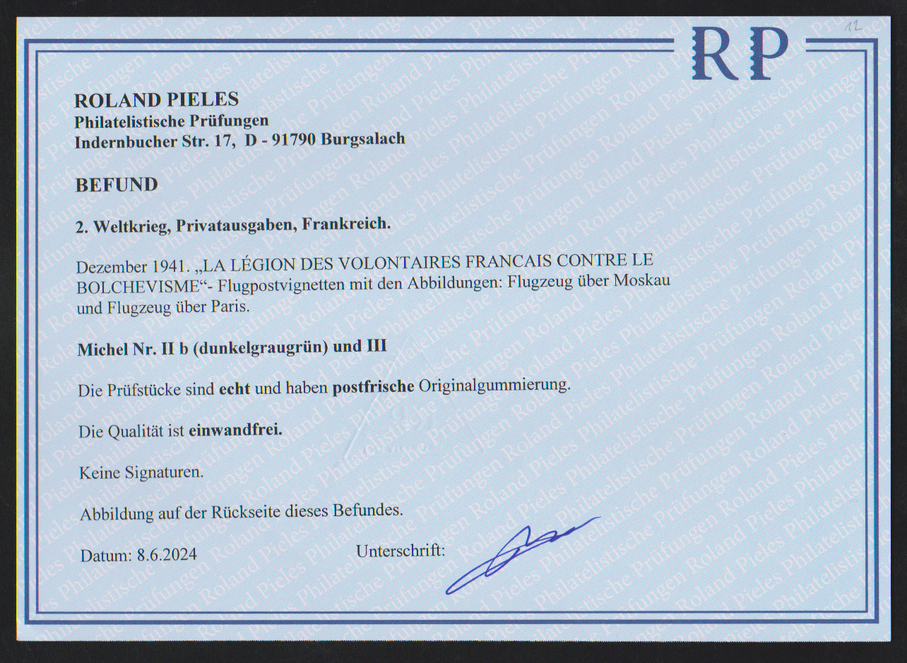 Legionsausgaben, Flugpost-Vignetten, zwei postfrische Ausgaben, dabei Nr. V mit Plattenfehlern I und II, je Fotoexp. Pieles. Mi. 300,-